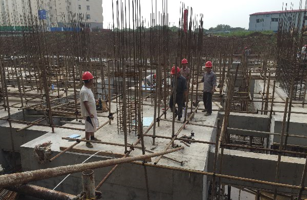 現(xiàn)場(chǎng)指揮部總指揮謝總工帶我們參觀了現(xiàn)場(chǎng)并大概介紹了各個(gè)棟號(hào)施工進(jìn)度等方面的情況。我們首先進(jìn)入16#樓施工現(xiàn)場(chǎng),該棟號(hào)的項(xiàng)目經(jīng)理徐斌親自現(xiàn)場(chǎng)督促,施工現(xiàn)場(chǎng)緊鑼密鼓的進(jìn)行基礎(chǔ)承臺(tái)柱墻的鋼筋綁扎工作。剛剛完成的現(xiàn)澆混凝土承臺(tái)及承臺(tái)梁整體觀感好,整潔干凈、規(guī)范美觀。據(jù)謝總工介紹施工人員在混凝土澆筑時(shí),先攤平振搗密實(shí),然后用抹子抹平,緊接著再用掃帚在已抹好的面層上輕輕掃一遍,再用薄膜覆蓋住才能達(dá)到好的效果。承臺(tái)上正在綁扎鋼筋的墻柱,每個(gè)樣板上都張貼著相應(yīng)的構(gòu)件尺寸及鋼筋信息,便于檢查核對(duì)和施工操作,體現(xiàn)出該工程現(xiàn)場(chǎng)施工人員嚴(yán)謹(jǐn)認(rèn)真的工作態(tài)度。
