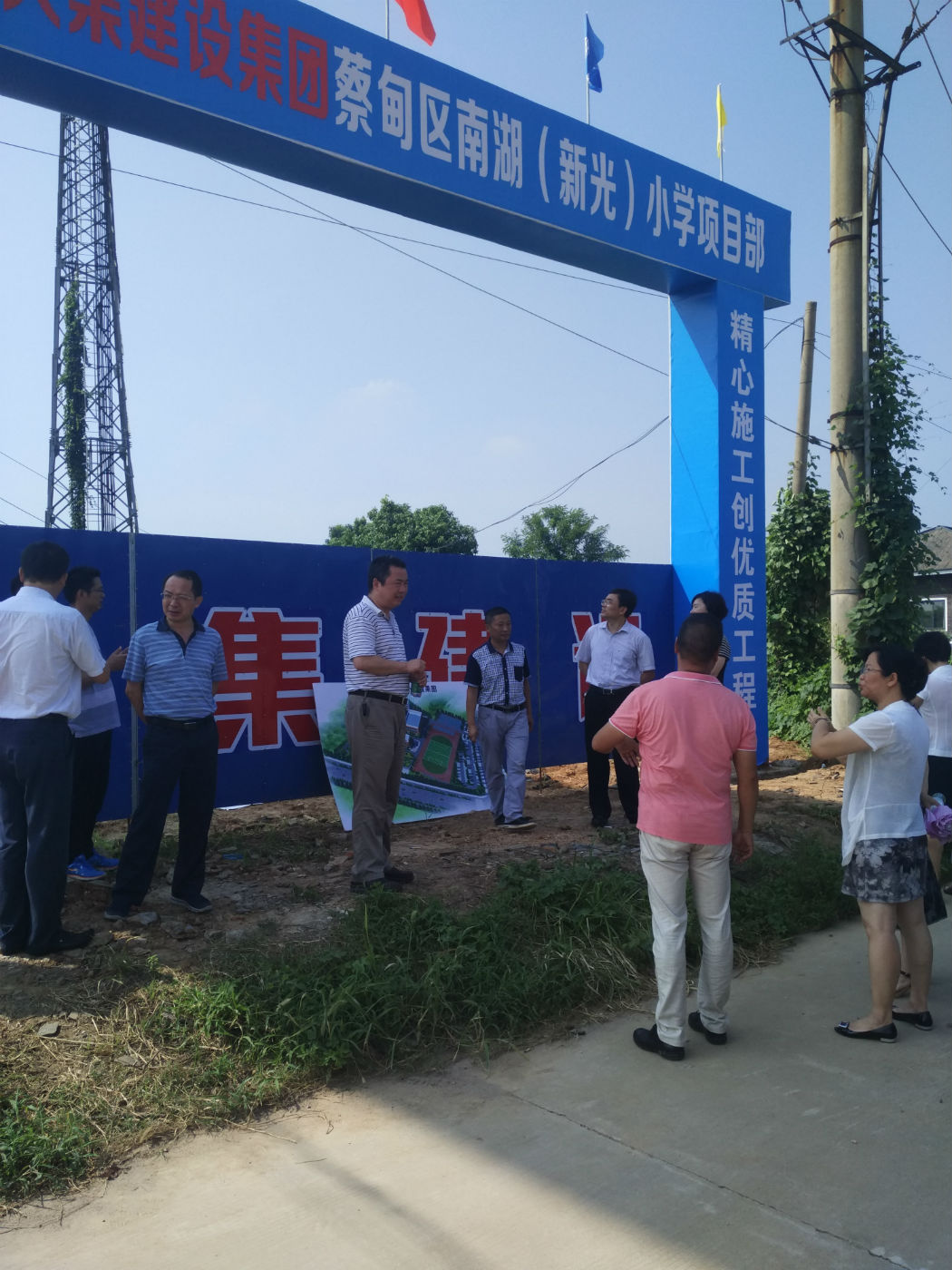 2016年8月12日,上午9:30武漢市教育局主要領(lǐng)導(dǎo)一行8人來到蔡甸區(qū)天鵝湖大道,考察了南湖(新光)小學(xué)建設(shè)情況。區(qū)教育局領(lǐng)導(dǎo),集團(tuán)公司徐副總及工程部負(fù)責(zé)人一起陪同。