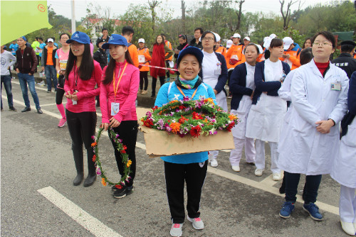 紅旗招展,彩旗飄飄,集團(tuán)公司60人健康跑隊伍浩浩蕩蕩邁入前方檢錄點(diǎn)