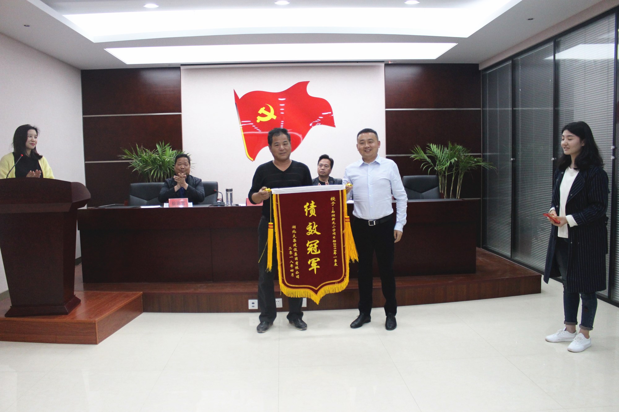 會議開始,由人事行政部公布第一季度績效考評結(jié)果,董事長徐濤親自向一季度績效冠軍——南湖(新光)小學(xué)項目頒發(fā)10000元獎金。