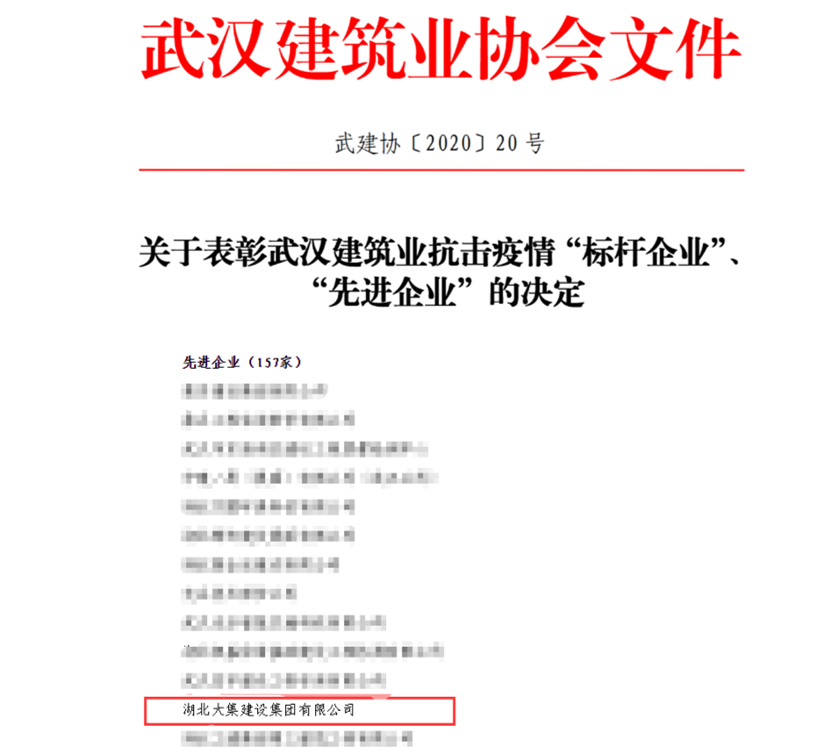 4月14日,武漢建筑業(yè)協(xié)會發(fā)布《武建協(xié)〔2020〕20 號——關(guān)于表彰武漢建筑業(yè)抗擊疫情“標(biāo)桿企業(yè)”、“先進(jìn)企業(yè)”的決定》,對在抗疫“主戰(zhàn)場”積極擔(dān)責(zé),奮不顧身、盡銳出戰(zhàn),與死神賽跑、與疫魔競速的27家武漢建筑業(yè)“標(biāo)桿企業(yè)”、157家“先進(jìn)企業(yè)”進(jìn)行表彰。湖北大集建設(shè)集團因在抗疫過程中主動作為、勇于擔(dān)當(dāng),獲評“先進(jìn)企業(yè)”榮譽稱號。