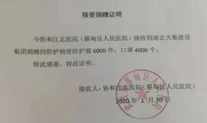 集團公司向蔡甸區(qū)人民醫(yī)院捐贈防護(hù)物資