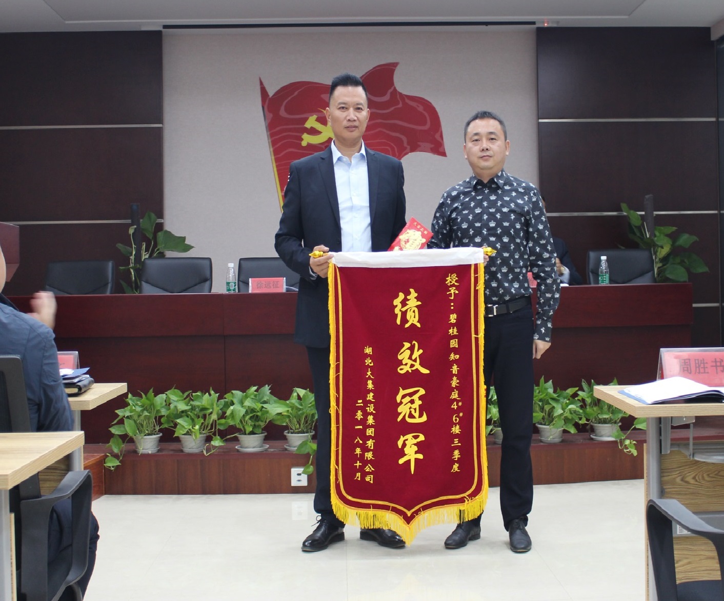 隨后,集團董事長徐濤為此次績效考評中的冠軍項目——碧桂園4#、6#項目部頒發(fā)錦旗和獎金。