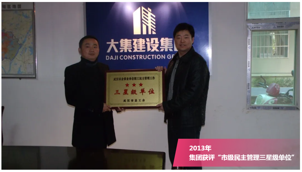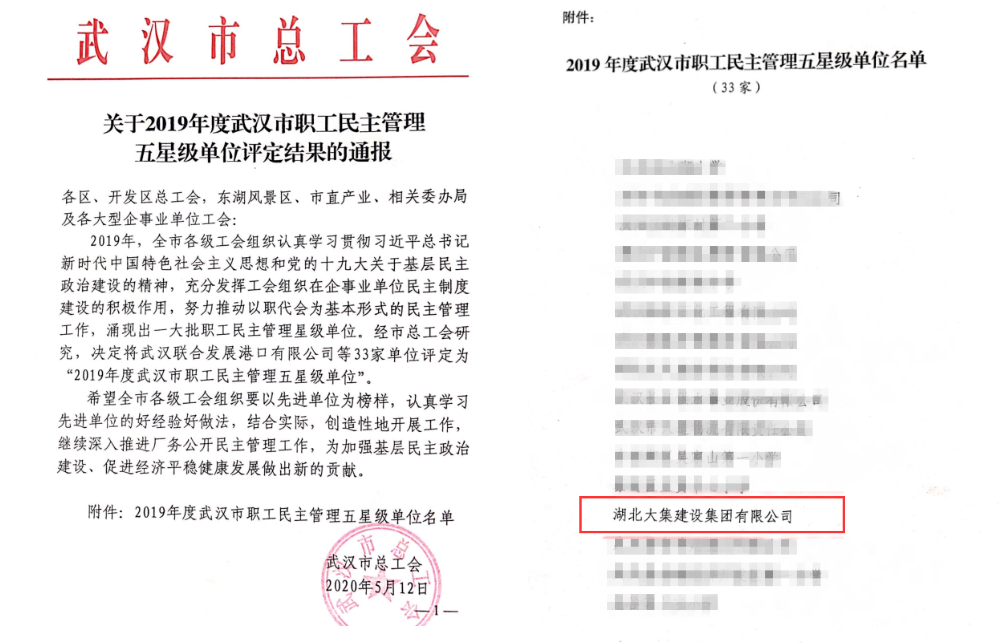 近日,武漢市總工會下發(fā)文件,湖北大集建設集團通過復審評定,榮獲“2019年度武漢市職工民主管理五星級單位”榮譽稱號,武漢市僅33家單位獲此殊榮。該項榮譽是武漢市企務公開民主管理工作最高級別的獎項,也是湖北大集建設在公司推行民主管理領(lǐng)域獲得的又一殊榮。
